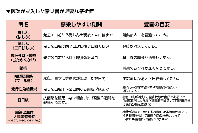 保育所(園)は、乳幼児が集団で長時間生活を共にする場です。 感染症の集団発症や流行をできるだけ防ぐことで、一人ひとりの子どもが1日快適に生活できるよう、下記の感染症について意見書の堤出をお願いします ※感染力のある期間に配慮し、子どもの健康回復状態が、集団での保育所(園)生活が可能な状態となってからの登園であるようご配慮ください。